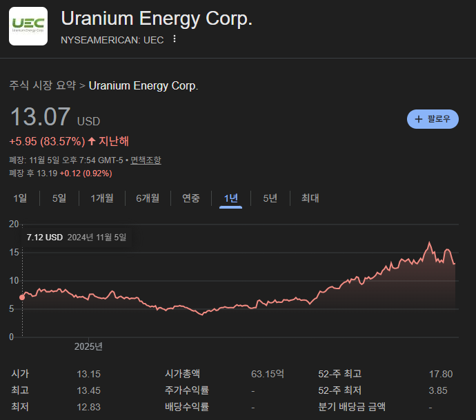 • UEC / UUUU: 원자재(우라늄)에 직접 투자하는 것입니다. AI-SMR 붐이 우라늄 가격 자체를 끌어올릴 것이라는 장기 베팅입니다.