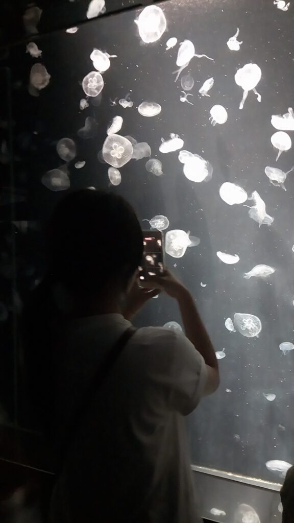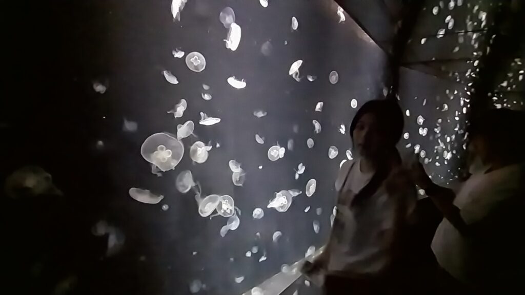 한 폭의 수묵화, 해파리 은하 (Jellyfish Galaxy) 관람 동선의 막바지에 다다르면 몽환적인 분위기의 ‘해파리 존’이 나타납니다. 개인적으로 가장 예술적이라고 느꼈던 공간입니다. 일반적인 수족관과 달리 이곳은 조명을 최대한 억제하고 배경을 어둡게 처리하여, 해파리의 움직임 그 자체에 집중하게 합니다. 하늘하늘 움직이는 해파리의 촉수가 마치 어둠 속에 그려지는 하얀 수묵화처럼 느껴졌습니다. 멍하니 보고 있으면 마음이 차분해지는 ‘물멍’의 최적 장소입니다. 사진을 찍으면 배경이 까맣게 날아가고 해파리만 선명하게 담겨 매우 감각적인 결과물을 얻을 수 있습니다.