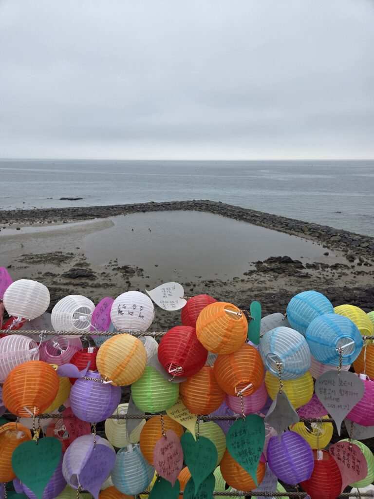 마당 한편에는 형형색색의 소원등이 줄지어 걸려 있어 회색빛 겨울 풍경에 생기를 더해주었습니다. 가족들의 건강과 행복을 비는 수많은 사람의 염원이 담긴 듯했습니다. 저희 가족도 바다를 배경으로, 소원등 앞에서 서로 하트를 그리며 인증샷을 남겼습니다. 가족이 함께 웃고 떠들며 사진을 찍는 이 순간이 여행의 가장 큰 보물이 아닐까 싶습니다.