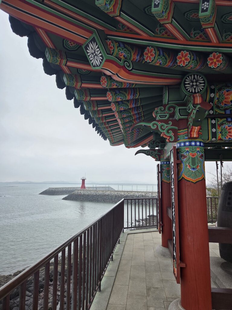 범종각 옆에서 바라보는 서해의 풍광은 그야말로 절경입니다. 날씨가 맑은 날에는 낙조가 환상적이라는데, 흐린 날은 흐린 날대로 차분하고 운치 있는 분위기를 즐길 수 있어 좋았습니다.