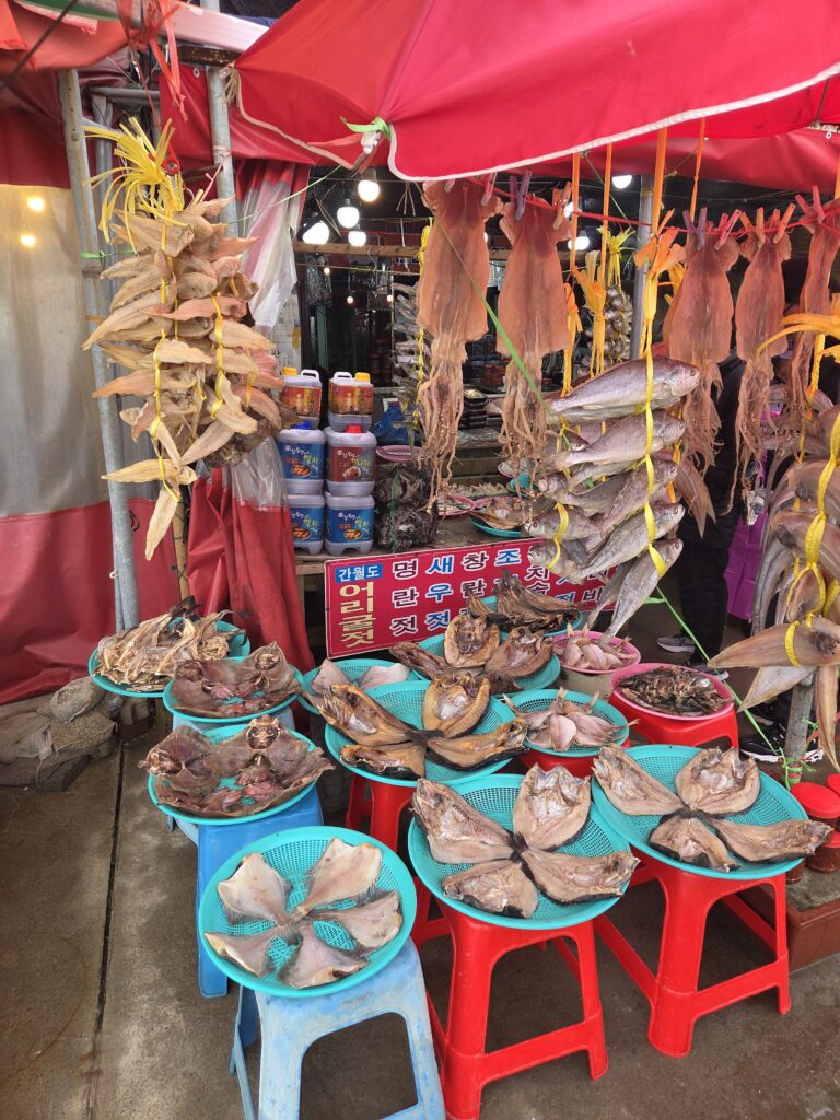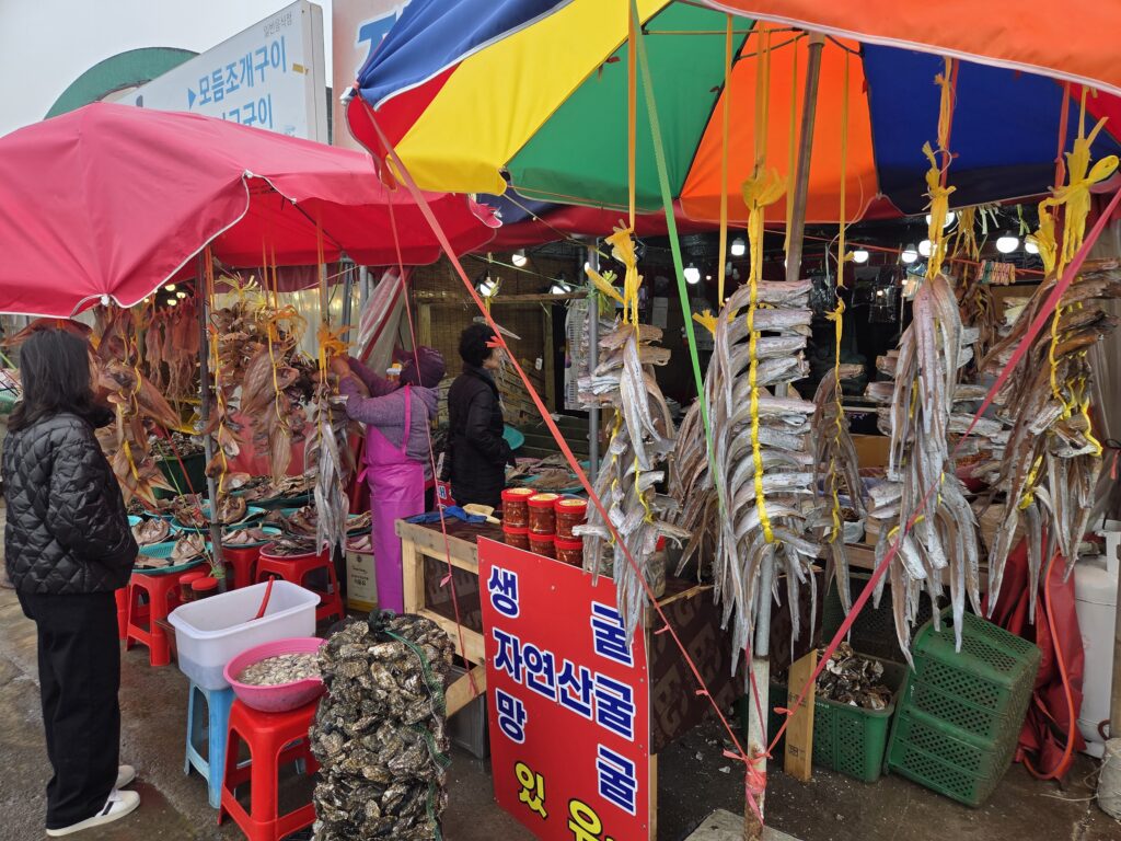 사진처럼 해풍에 꾸덕꾸덕하게 말라가는 생선들과 싱싱한 자연산 굴을 파는 모습을 보니 시골 장터에 온 듯한 정겨움이 느껴졌습니다. “생굴, 자연산 굴 있어요~”라고 외치는 상인들의 활기찬 목소리에서 삶의 에너지를 얻을 수 있었습니다. 저희는 이곳에서 종종 사먹던 박대와 첫째 딸이 먹고싶어하던 새우장을 샀습니다. 다음날 새우장을 먹어봤는데 너무 짜지않고, 대하의 살이 통통하게 올라서 정말 맛나더군요!!! 박대도 곧 와이프한테 구워달라해야지요 ㅋ