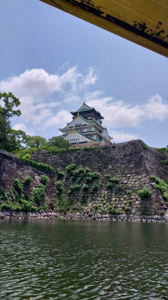 배에 오르면 약 20분간 오사카성 내해(Inner Moat)를 순회합니다. 벚꽃이 만개하는 4월에는 배 위에서 꽃비를 맞는 환상적인 뷰를 자랑한다지만, 녹음이 우거진 6월의 풍경도 그에 못지않게 훌륭했습니다. 높은 석벽이 만들어내는 그늘과 물 위를 스치는 시원한 바람은 초여름의 더위를 잊게 하기에 충분했습니다. 육지에서 올려다보는 천수각과 달리, 수면 위에서 바라보는 천수각은 더욱 웅장하고 입체적으로 다가옵니다. 성벽의 거대한 돌들이 물에 비치는 반영(Reflection) 또한 놓칠 수 없는 포토 포인트입니다.