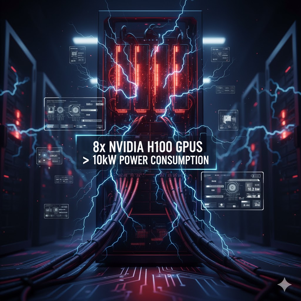 가장 심각한 문제입니다. 과거 CPU 기반 서버는 1개의 랙(Rack, 서버를 꽂는 캐비닛)당 5~10kW의 전력을 소비했습니다. 하지만 엔비디아 H100 GPU 8개가 꽂힌 서버 1대의 전력 소모가 10kW를 넘습니다. 이런 서버가 랙 하나에 4~8대씩 꽂히면, 랙 1개당 전력 소모가 50kW, 100kW, 심지어 150kW까지 치솟습니다.
