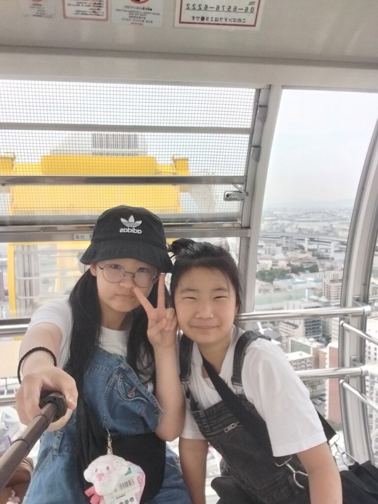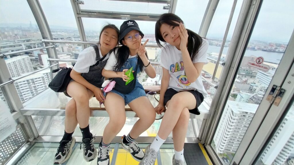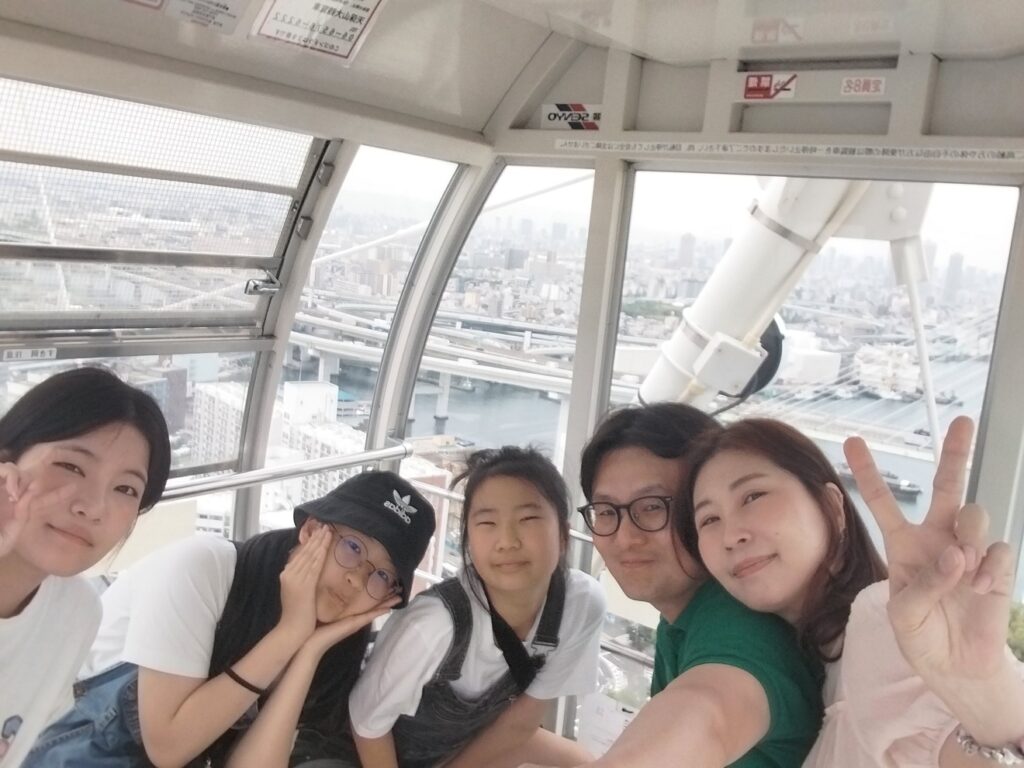 바다 위 112.5m 상공에서의 휴식 (feat. 간식 타임) 곤돌라 내부는 생각보다 훨씬 넓고 쾌적했습니다. 최대 8명(권장 6명)까지 탑승 가능한 넉넉한 공간이라 저희 4인 가족이 타기에 아주 여유로웠습니다. 투명한 바닥 아래로 작아지는 사람들과 자동차를 보는 것은 꽤 아찔했지만, 동시에 가슴이 뻥 뚫리는 시원함을 선사했습니다. 창문 너머로는 오사카만(Osaka Bay)의 푸른 바다, 저 멀리 유니버설 스튜디오 재팬(USJ), 그리고 아카시 해협 대교까지 파노라마 뷰가 펼쳐졌습니다. 탑승 시간은 약 15분 정도 소요되는데, 체감상으로는 30분처럼 느껴질 정도로 여유로웠습니다. 저희는 편의점에서 미리 사 온 간단한 간식을 먹으며, 오전 내내 걷느라 지친 다리를 쉬게 해주었습니다. 하늘 위에서 우리 가족끼리만 즐기는 오붓한 피크닉 같은 시간이었습니다.