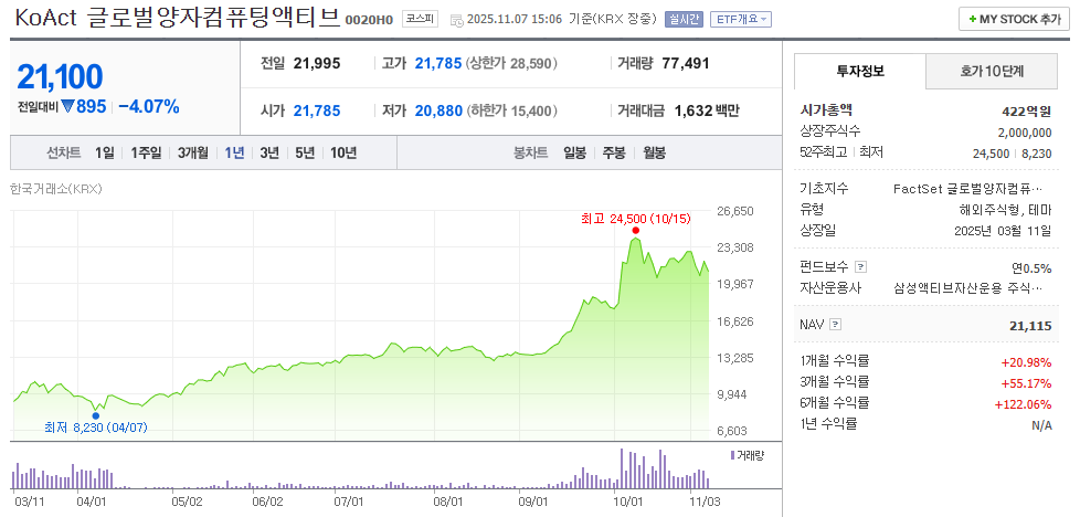 - 3. 생성 시점 및 흐름: 2025년 3월 11일 상장. 52주 최저가 8,230원에서 최고가 24,500원까지, 매우 높은 변동성을 보이며 액티브하게 운용되었습니다.