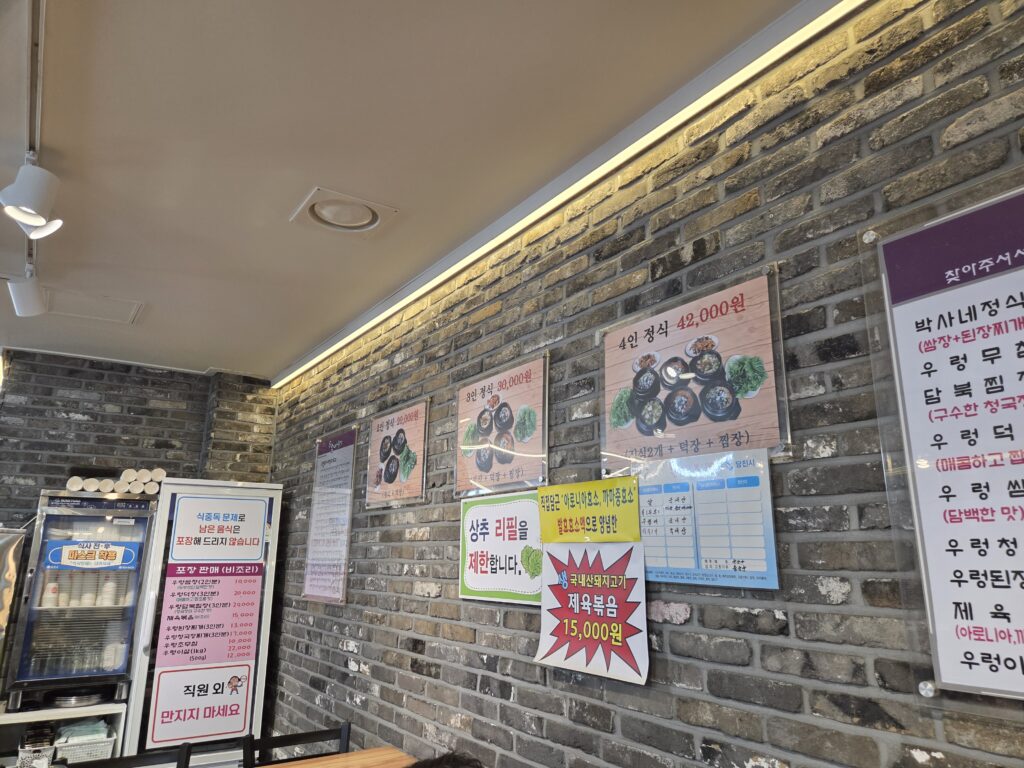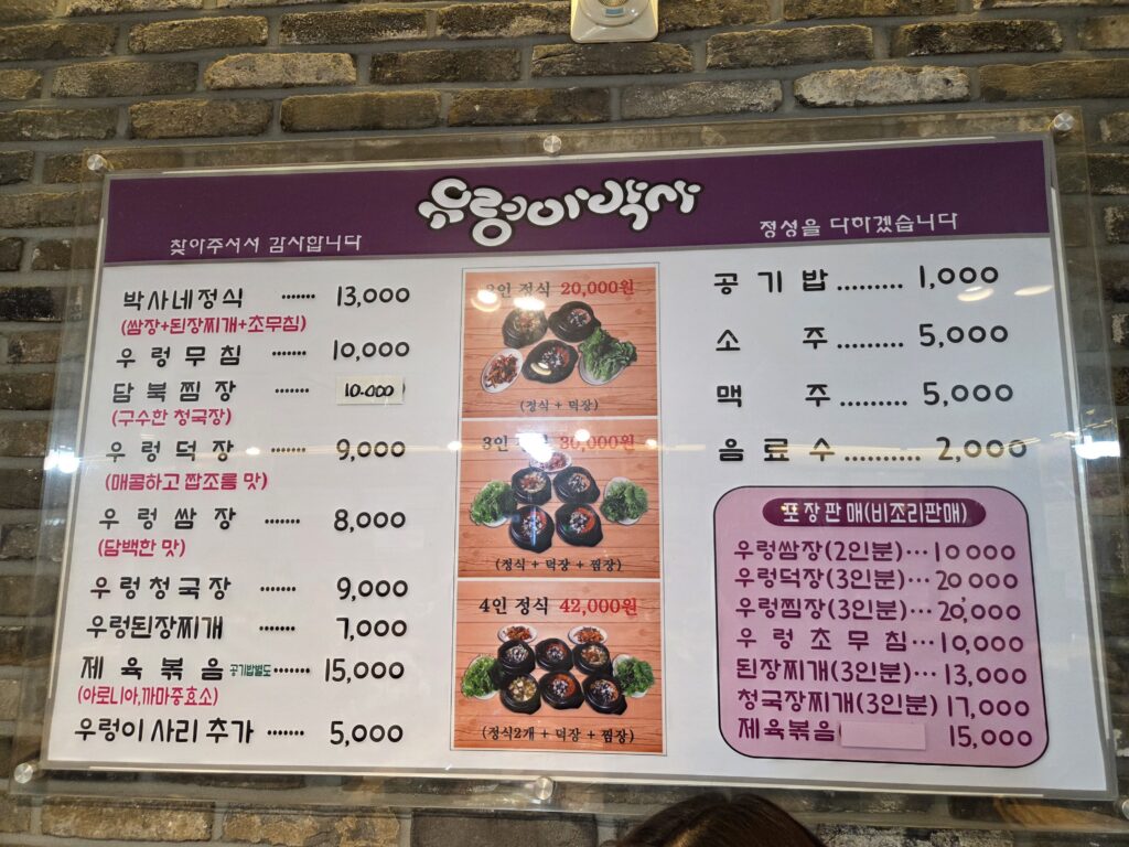 - 우렁찜장 (구수한 청국장 맛): 청국장 베이스의 찜으로 깊고 진한 맛이 특징입니다. (메뉴판에는 ‘담북찜장’이라고도 표기되어 있네요.)