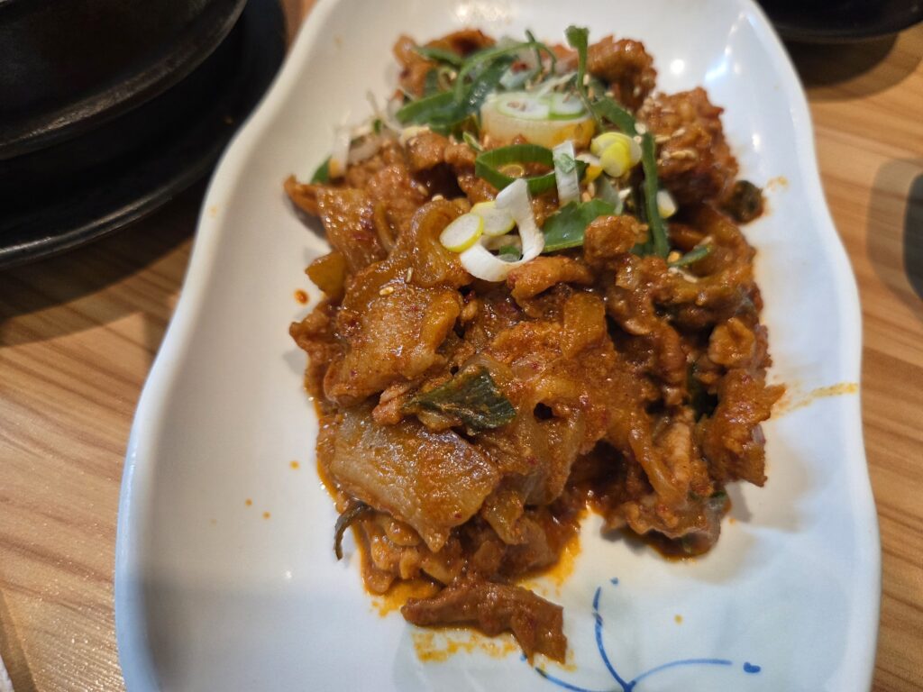 쌈밥에 고기가 빠지면 섭섭하죠? 추가로 주문한 제육볶음입니다. (1만5천원) 불향이 은은하게 나면서 양념이 잘 배어 있어, 우렁이 쌈장과 함께 쌈을 싸 먹을 때 환상의 궁합을 자랑합니다. 고기의 육질도 부드러워 아이들이 특히 좋아했습니다.