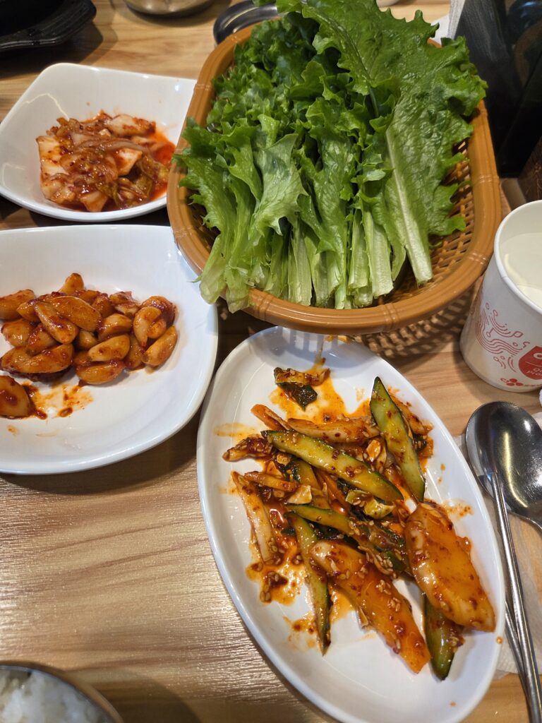 쌈밥집의 생명은 채소의 신선도입니다. 상추와 마늘, 고추가 바구니에 담겨 나오는데, 상추가 매우 연하고 싱싱했습니다. (참고로 이곳은 ‘상추 리필 제한’이라는 문구가 있을 정도로 채소 관리에 신경을 쓰는 듯했습니다. 다행히 저희는 부족함 없이 먹었습니다.) 따뜻한 흰 쌀밥 위에 짭조름한 우렁덕장을 올리고, 상추에 싸서 한 입 크게 넣으면… 여행의 피로가 싹 풀리는 기분입니다. “아, 역시 한국 사람은 밥심이고 된장 힘이구나”라는 생각이 절로 듭니다.